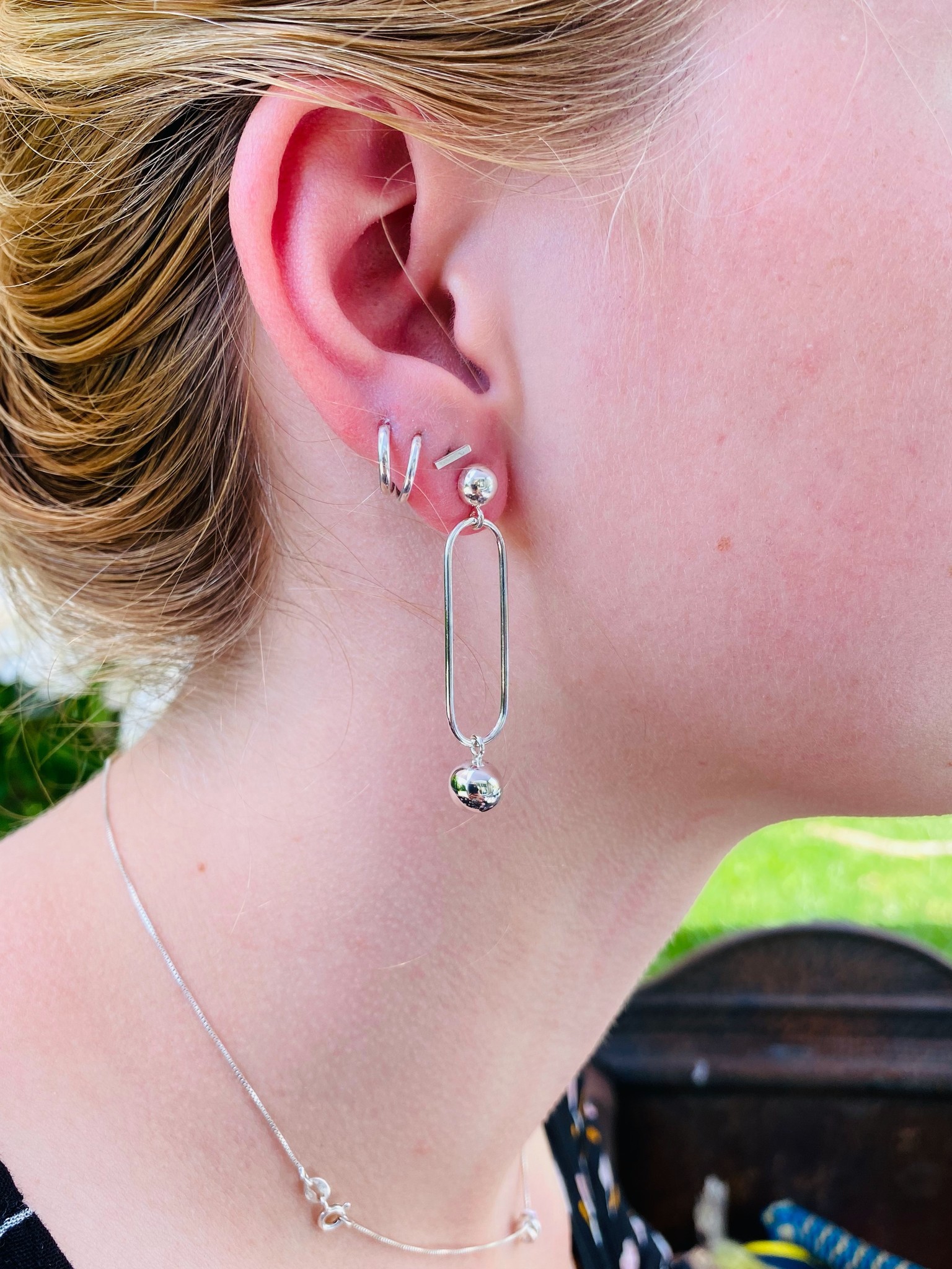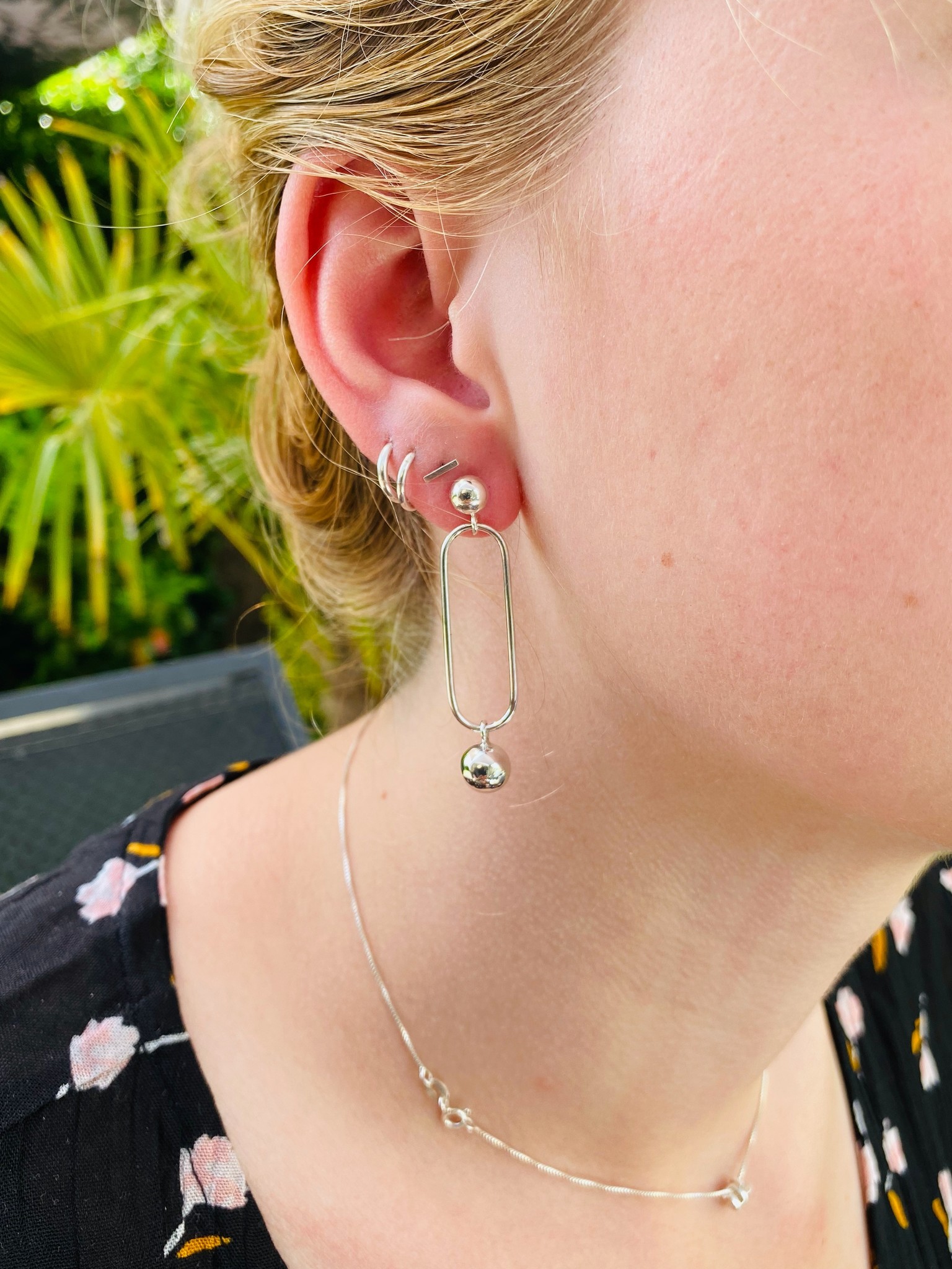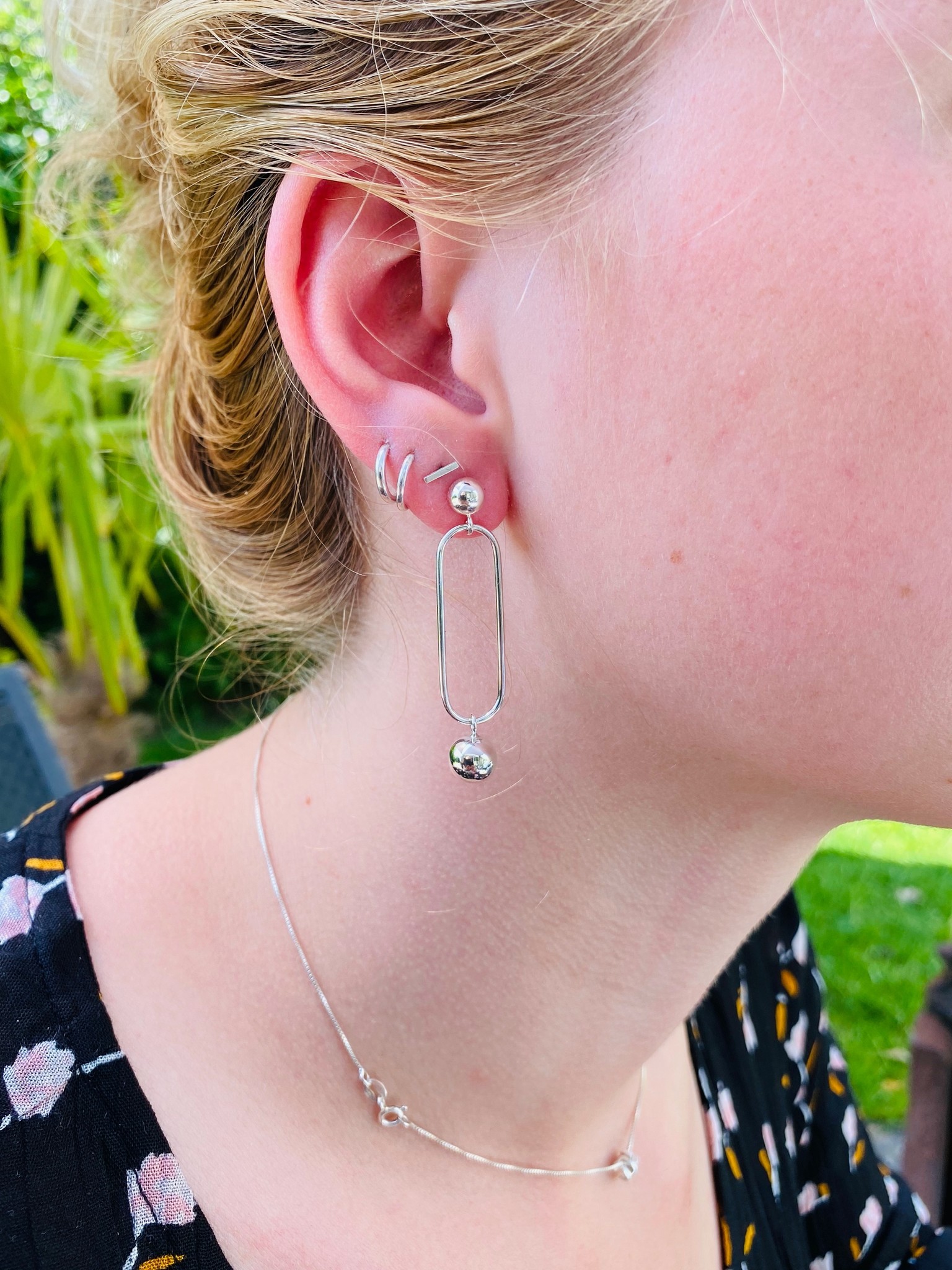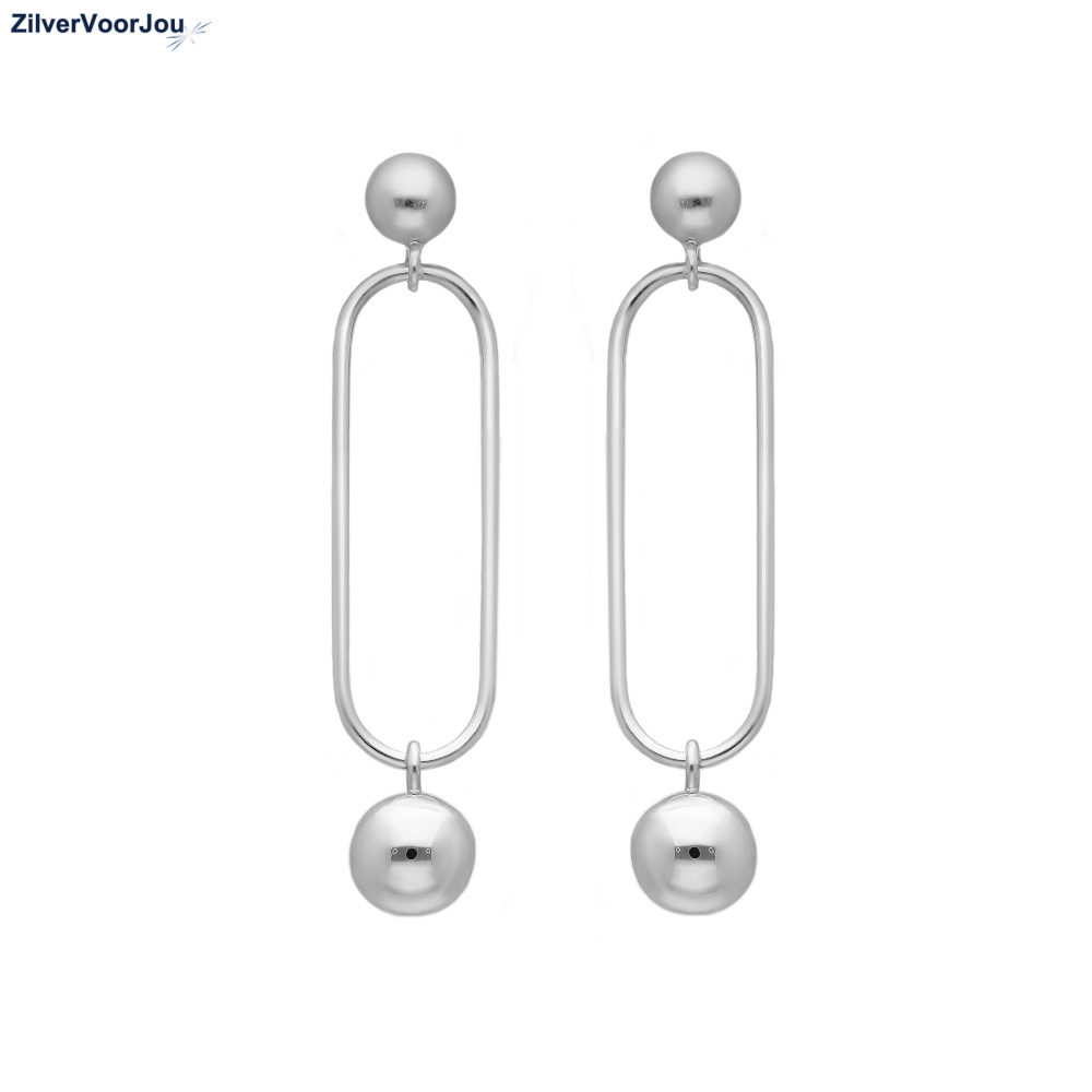 Hoogglans zilveren strak design oorhangers. Ronde oorsteker met daaronder een ovale zilveren buis hanger aan deze ovale buis hangt een rond balletjes. Oorbellen voor een elegante strakke look.