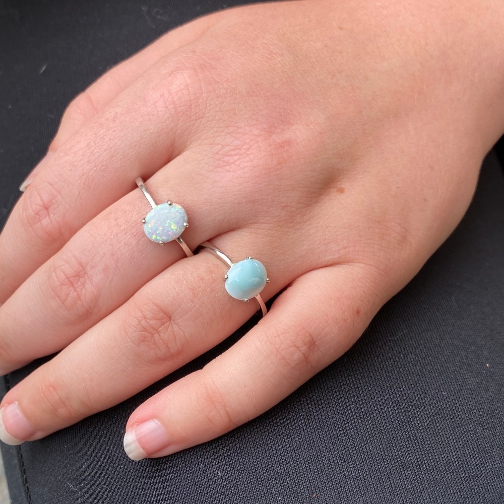 De ring heeft een ringkop van 10 mm. Het larimar steentje is 10 x 8 mm.