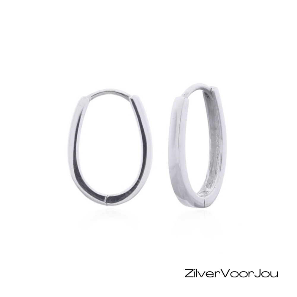Elegante ovale 16 mm lange huggie hoops of klapcreolen. Tijdloos design oorjuweeltjes. Gemaakt van 925 zilver met een mooie hoogglans zilveren buis die uitloopt van 2.1 mm boven aan de creool, tot 2.5 mm breed onderaan de creool. Afgewerkt met een rhodium beschermlaagje.