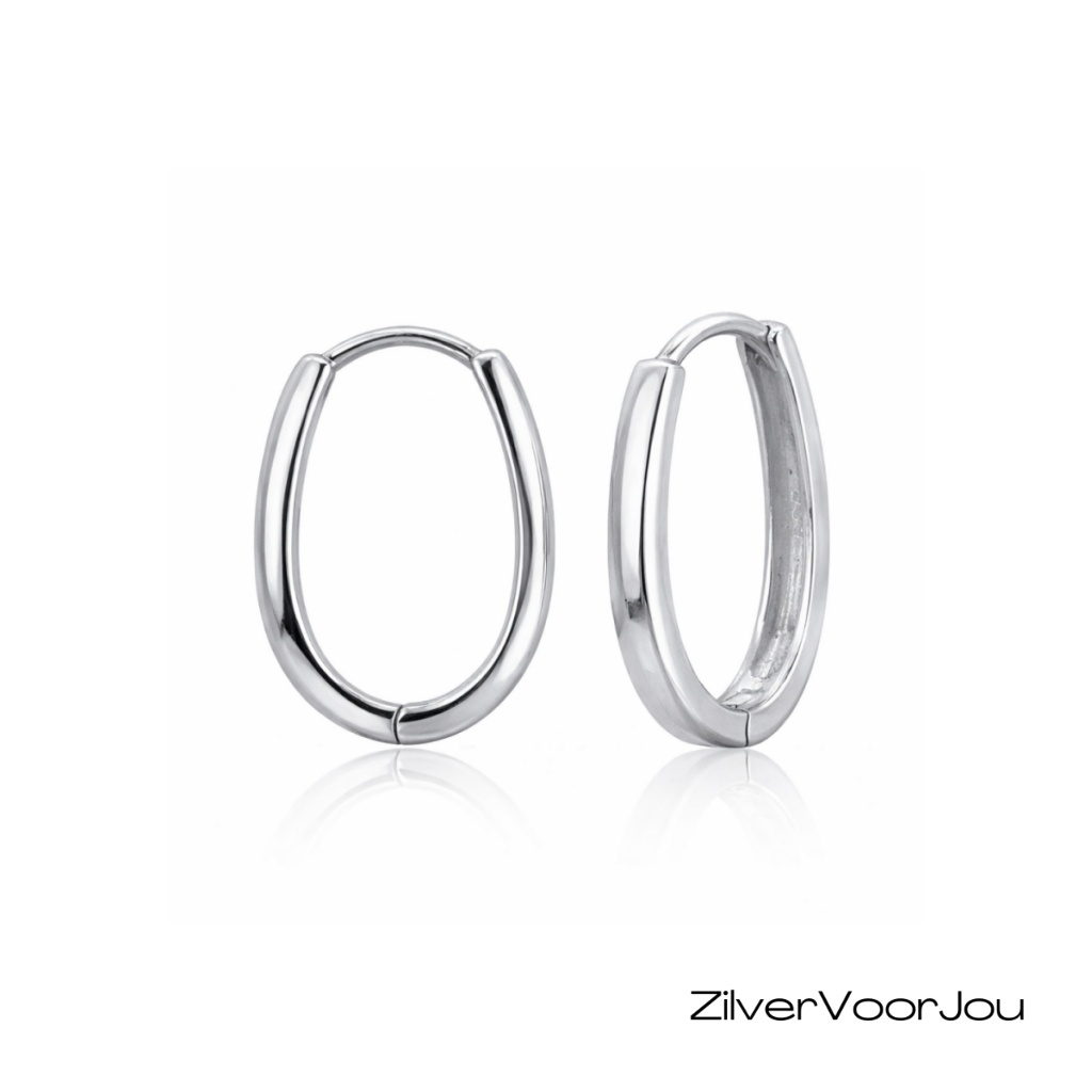 Elegante ovale 16 mm lange huggie hoops of klapcreolen. Tijdloos design oorjuweeltjes. Gemaakt van 925 zilver met een mooie hoogglans zilveren buis die uitloopt van 2.1 mm boven aan de creool, tot 2.5 mm breed onderaan de creool.
