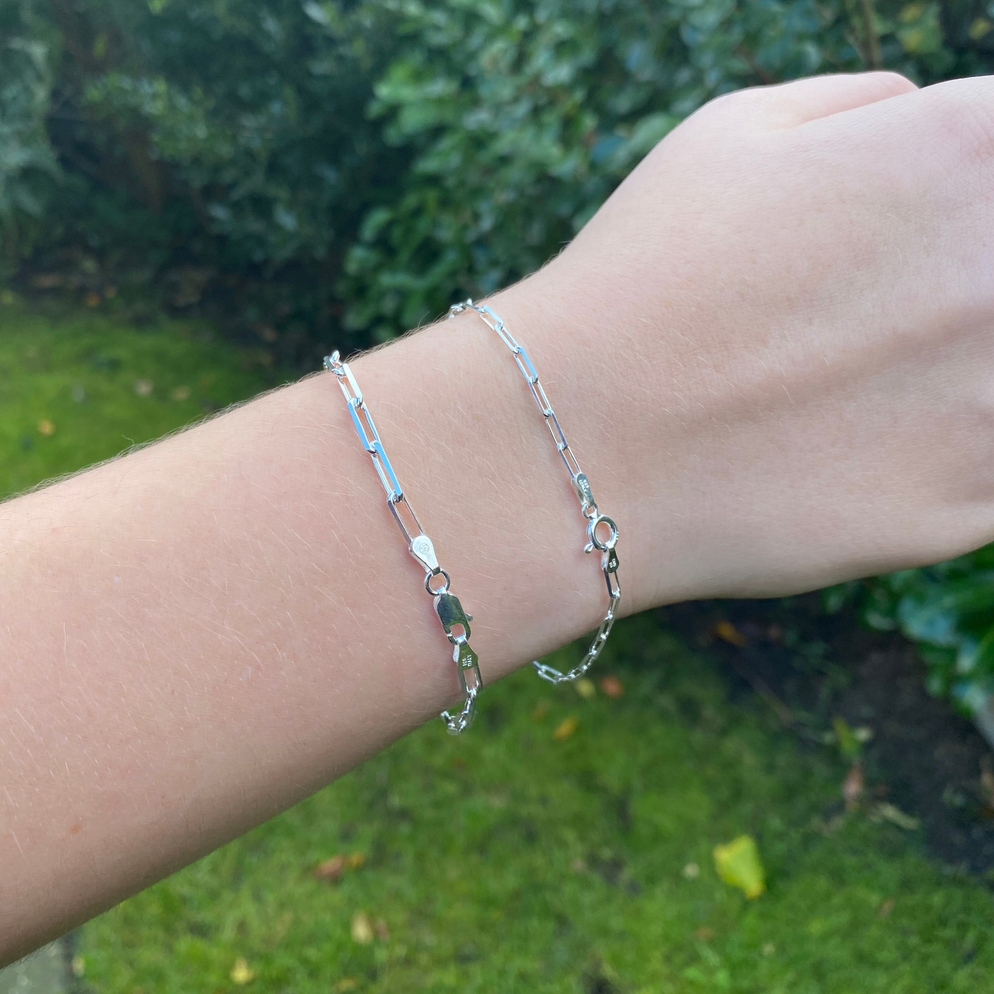Trende en modern paperclip of staple schakel armbandje. Het armbandje is gemaakt van 925 zilver en heeft een breedte van 2.2 mm. Verkrijgbare in 2 lengtes, 18 of 19 cm.