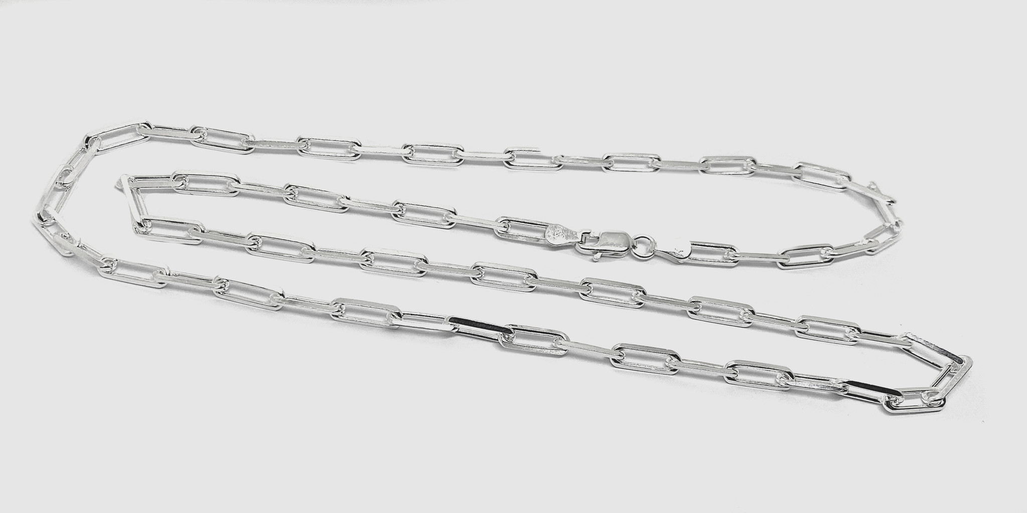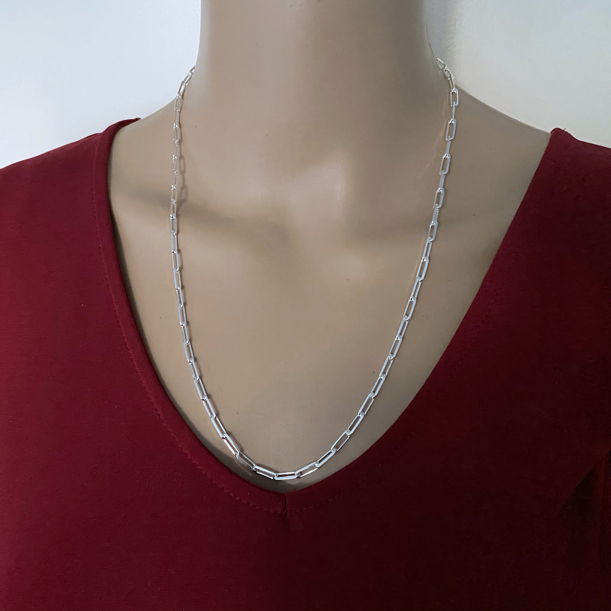 Mooie lange paperclip staple ketting gemaakt van 925 zilver. De lengte van de ketting is 55 cm en de schakel is 3.5mm breed. Prachtige ketting om zo te dragen maar ook trendy in combinatie met kortere dunnere lengte kettingen voor een layer look