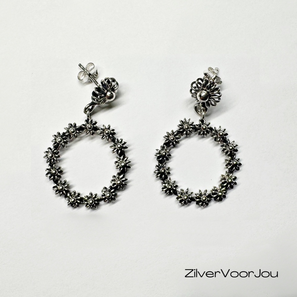 Deze prachtige ronde Pikul oorhangers zijn gemaakt van 925 zilver en bestaan uit een open ring opgebouwd uit kleine Pikul-bloemen. De gedetailleerde bloemblaadjes en de oxidatie geven de oorbellen een karaktervolle, stijlvolle en vintage uitstraling.