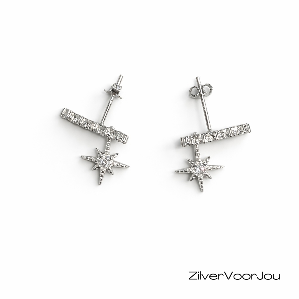 Erg leuke oorstekers met een rij van 5 witte zirkonia's, die meebuigen met je oor, met daaraan een ster hanger bezet met een witte zirkonia.