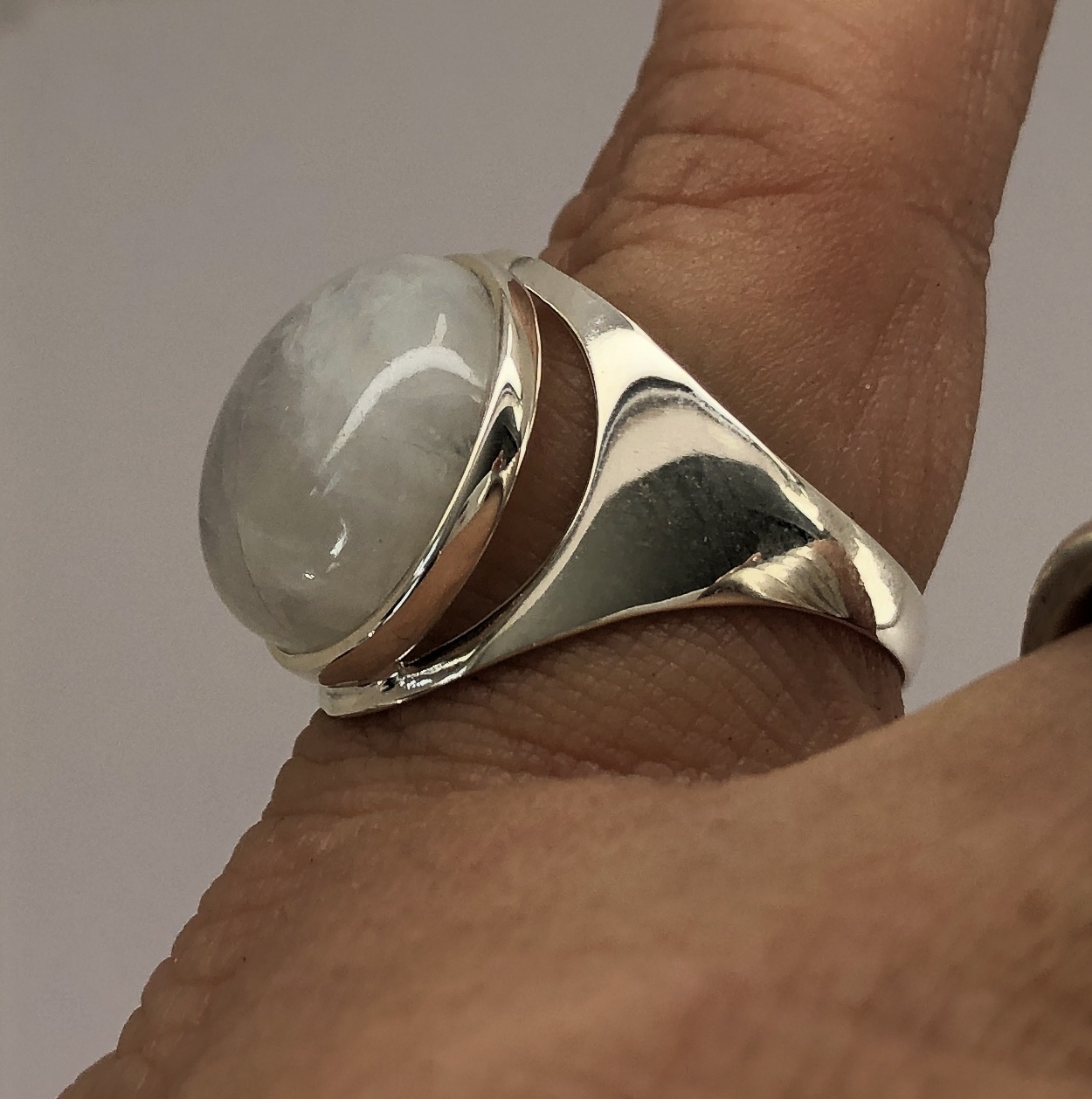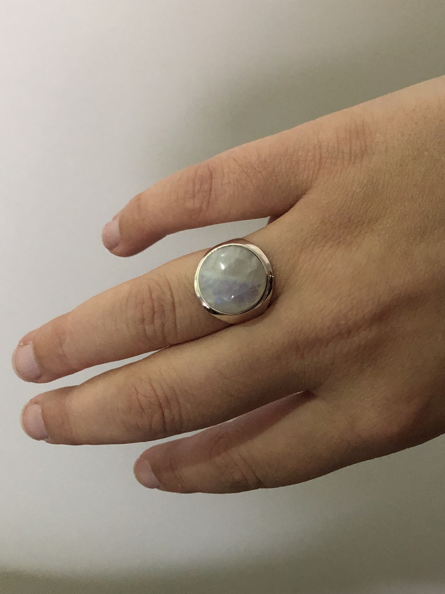 Grote hoogglans zilveren ring met een ronde regenboog maansteen. De diameter van de maansteen is 16 mm.