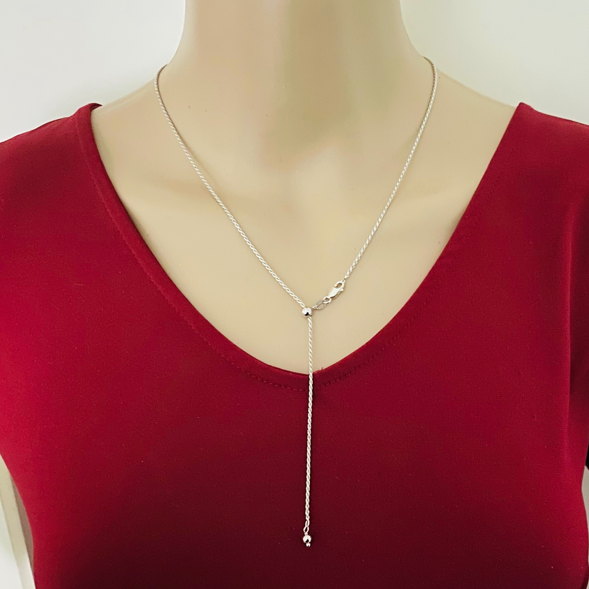 Zeer mooie echt zilveren rhodium rope ketting met een maximale lengte van 55 cm. De ketting is te verstellen naar de juiste lengte door het balletje te verschuiven. Prachtig collier.