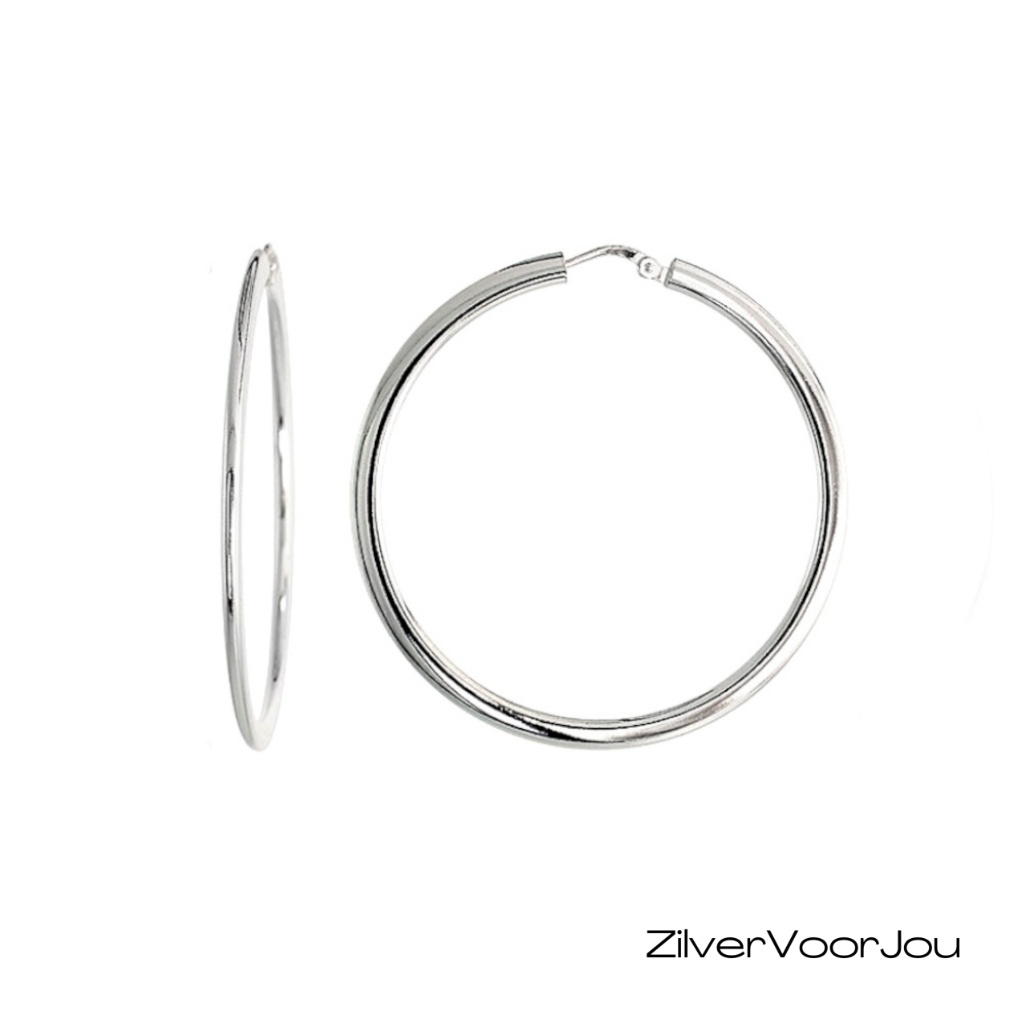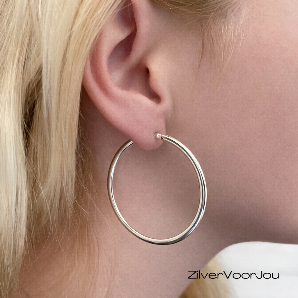 Design oorringen met een vlakke platte buis. Grote oorringen met een diameter van 45 mm. De buis is 1,9 mm dik en 3,4 mm breed. Geheel gemaakt van 925 zilver. De oorringen sluiten met een makkelijke scharnier sluiting met een korte pin.