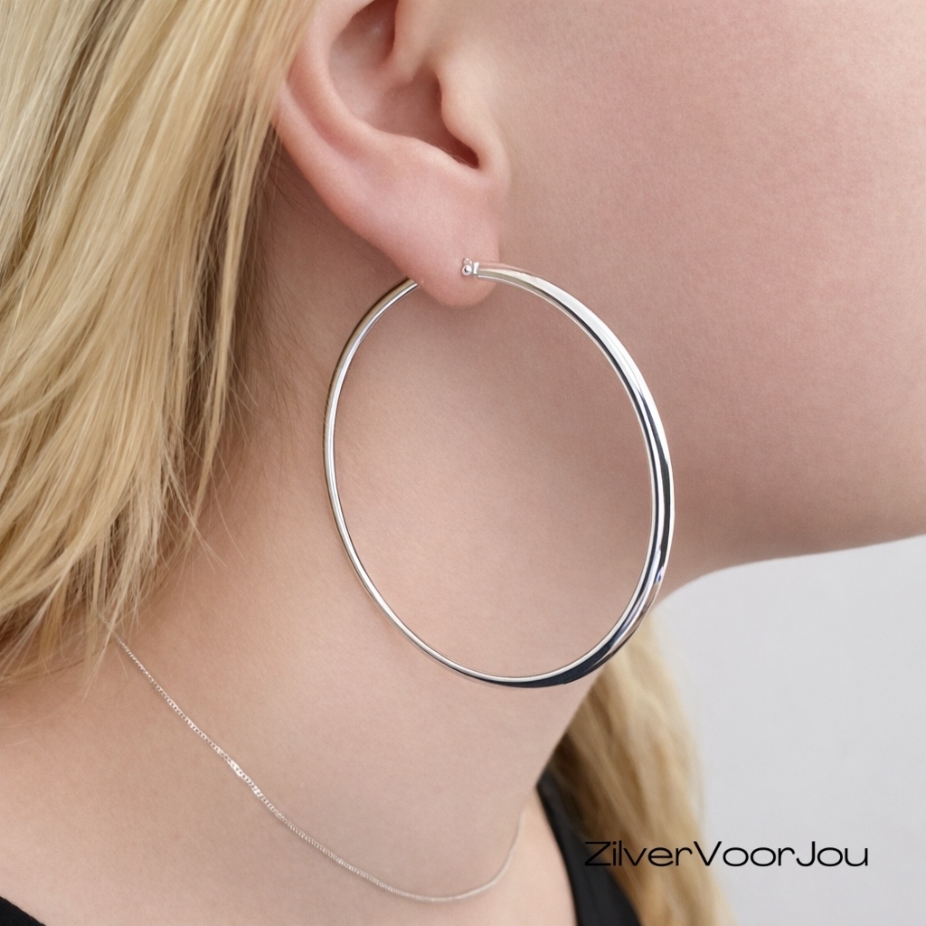 Design oorringen met een vlakke platte buis. Grote oorringen met een diameter van 65 mm. De buis is 2,25 mm dik en 3 mm breed. Geheel gemaakt van 925 zilver. De oorringen sluiten met een makkelijke scharnier sluiting.