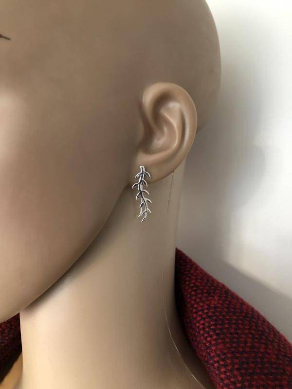 Echt zilveren oorklimmers in de vorm van lange bochtige takjes met aan beide zijden hetzelfde aantal bladen.