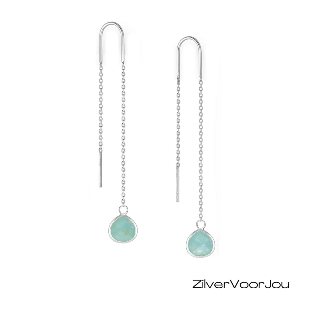 Deze mooie kleine en lichte 925 zilveren threader oorbellen zijn voorzien van amazoniet in een druppelvorm. Door de lange, slanke ketting hangen de oorbellen speels en stijlvol langs het gezicht. Amazoniet staat bekend om zijn rustgevende, zachte blauwgroene kleur die perfect past bij zowel casual als chique outfits.