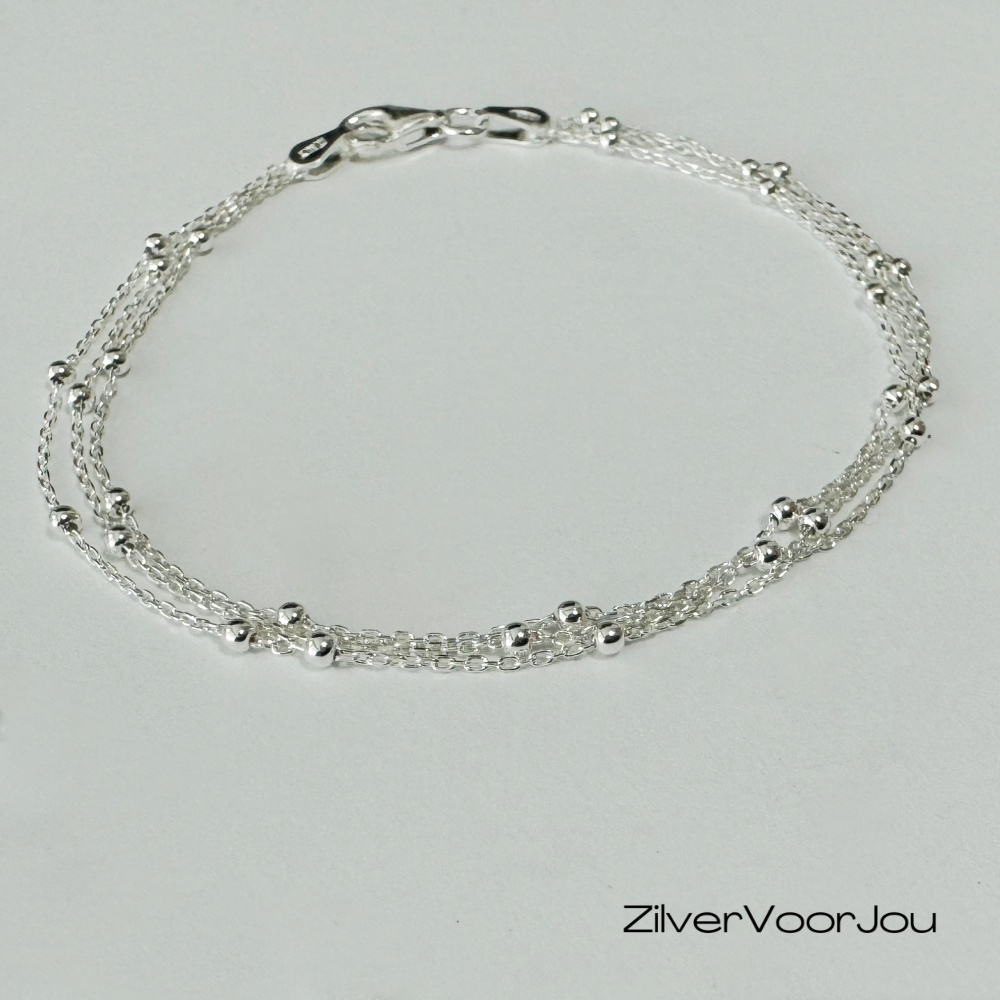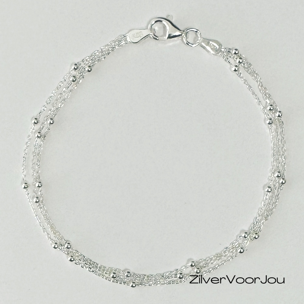 Super leuk armbandje met 3 kettinkjes bezet met kleine balletjes. Het armbandje is gemaakt van 925 zilver en heeft een lengte van 17,5 cm.