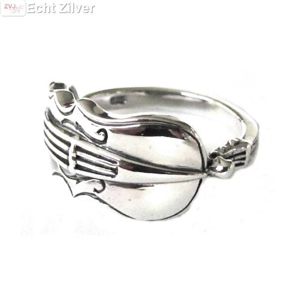 Een zilveren ring in de vorm van een viool die om je vinger krult.