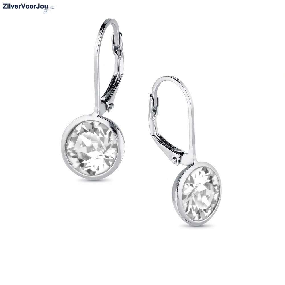 Schitterende luxe leverback oorhangers met ronde witte Oostenrijks kristallen. De oorbellen zijn gemaakt van 925 zilver en afgewerkt met een rhodium beschermlaag. De kristallen zijn gezet in een bezel zetting. De oorbellen sluiten met een mooie luxe en makkelijke leverback sluiting.