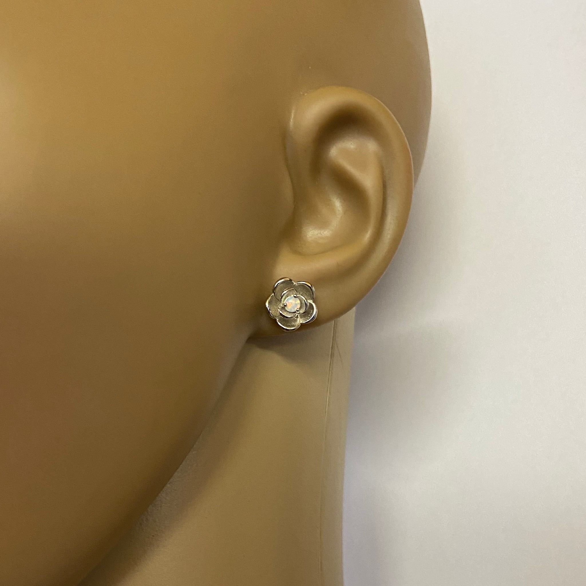 Zilveren witte opaal bloem oorstekers gemaakt van 925 zilver en gerhodineerd. Schitterende kleine juweeltjes. Het hart van de bloem heeft een kleine witte lab opaal. De oorstekers hebben een diameter van 10 mm. Fleur je dag op met deze mooie oorstekers.