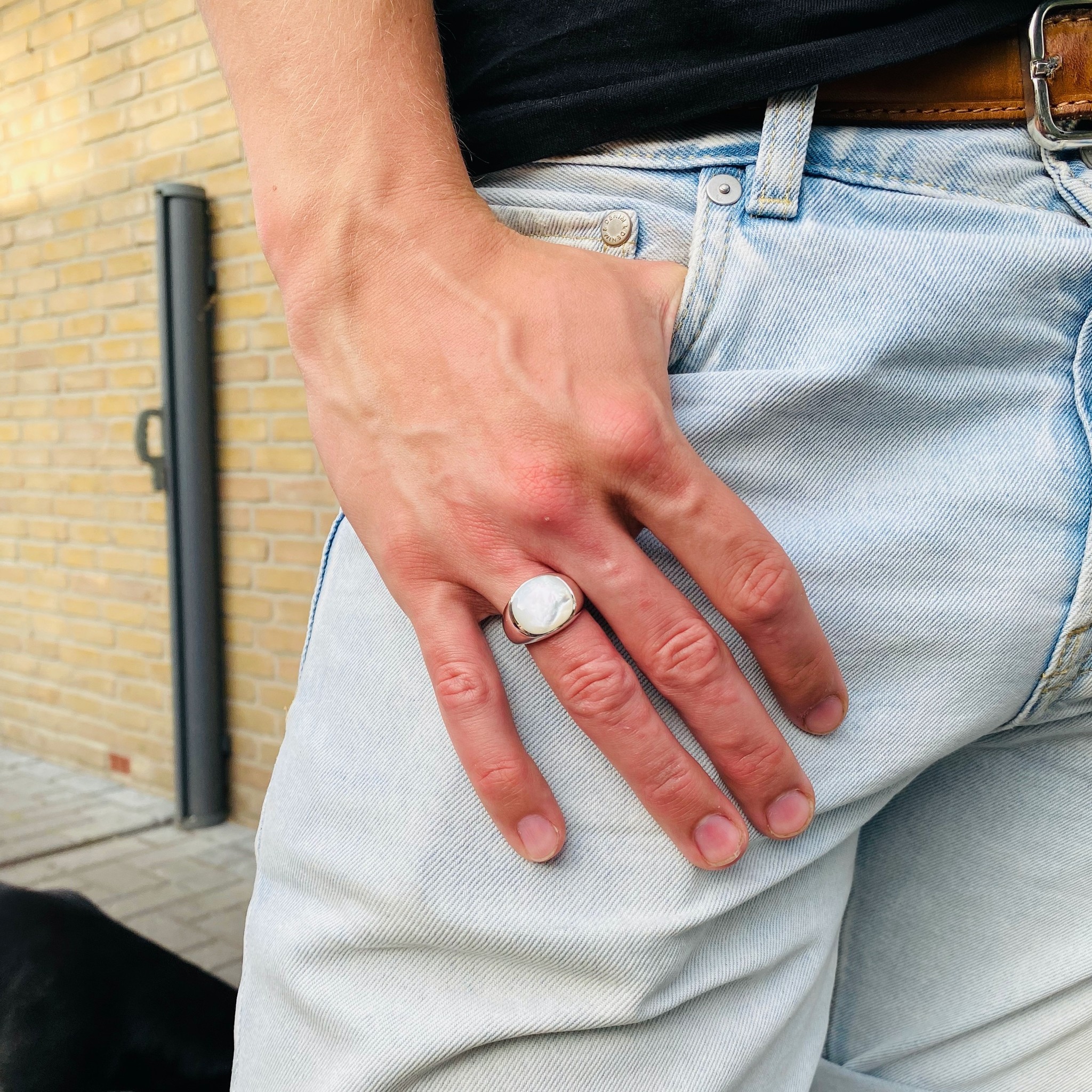 De ring is een uniseks ring ofwel voor heren en voor dames geschikt. Deze ring heeft een ringkop van 15 mm en de parelmoer is 14 x 14 mm groot. De ring heeft een gewicht van circa 12 gram.