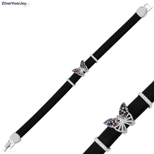 Schitterende zwarte synthetisch leren armband met zilveren sluiting en vlinder bezet met multicolor Cubic Zirconia.